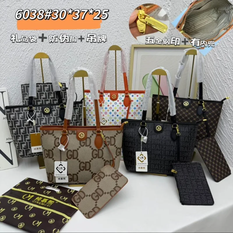 Chic designer-inspired tote bags with iconic patterns and gold handles, each with a coordinating wallet.
