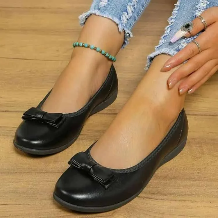 Black platform loafers with bow detail.