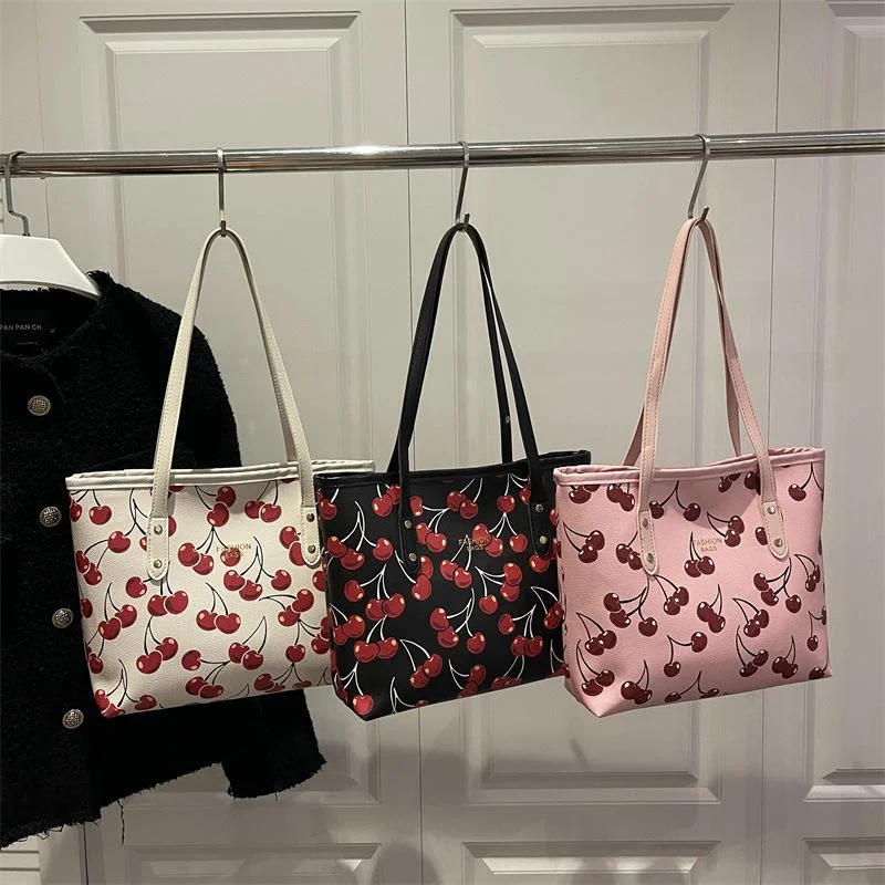 Cherry-print tote handbags with long shoulder straps.