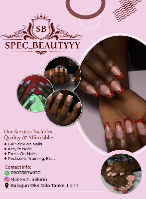 Spec beautyyy is a private nail studio specialized in crafting highly quality beautiful nail service. Gel nails Gel stick on nails Gel x nails Acrylic nails Toes Press on nails Pedicure Manicure Henna manicure Male manicure Nail art To make men and women feel beautiful, confident and ready to start their day without feeling crusty. Location : Tanke Oke Odo Ilorin / Unilorin campus
